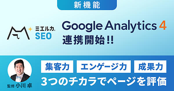 Webアナリストで同社取締役CAO(Chief Analytics Officer)の小川卓氏が監修した。ミエルカSEOとGA4のプロパティは数クリックで連携が完了し、GA4の計測データをミエルカSEOが取り込んで分析・改善を効率的にできる。GA4の各種データを「集客力」「エンゲージ力」「成果力」の3つの力に分類・集計してスコア評価が可能で、同様の役割を担うページ・コンテンツ同士を比較することで改善ポイントの発見が容易になる。
