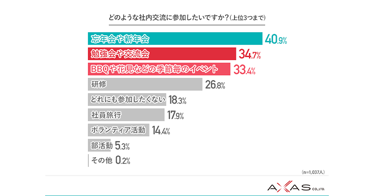 まず「どのような社内交流に参加したいか?」を聞くと、「忘年会や新年会」40.9%が多く、「勉強会や交流会」34.7%、「BBQや花見などの季節ごとのイベント」33.4%が続いた。一方で「どれにも参加したくない」18.3%は2割を切っており、意外と参加意向は高い。