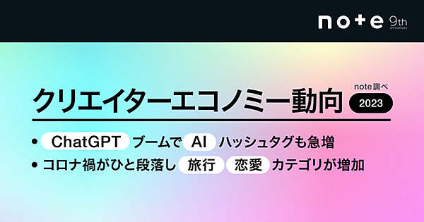 デジタルコンテンツ企画・制作・配信事業のnoteは、メディアプラットフォーム「note」がサービス開始から4月7日で9周年を迎えた、と同日発表した。noteで創作した記事を販売して収入を得ているクリエイターは累計12万7000人で、noteの有料記事数は1年で137万件増えた。拡大が加速している「クリエイターエコノミー」の直近1年間をまとめた「クリエイターエコノミー動向2023」も合わせて発表した。