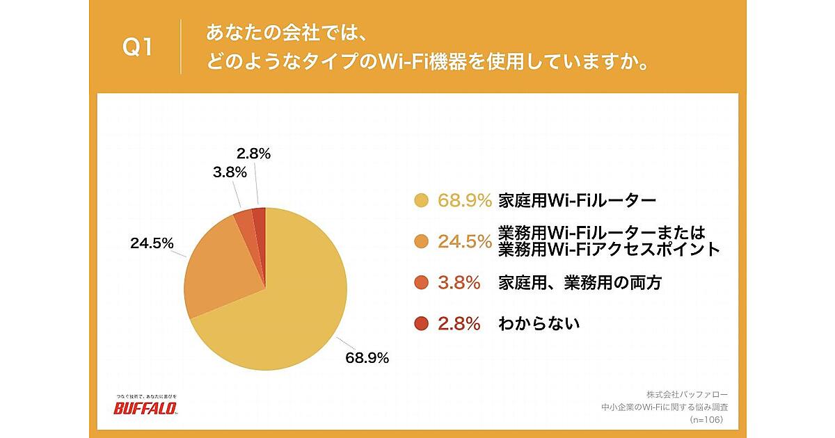メルコホールディングスグループのバッファローは、「中小企業のWi-Fi環境」に関する調査結果を発表した。自社にWi-Fi(無線LAN)を導入している、従業員数50人未満の企業の経営者・役員106人が回答している。