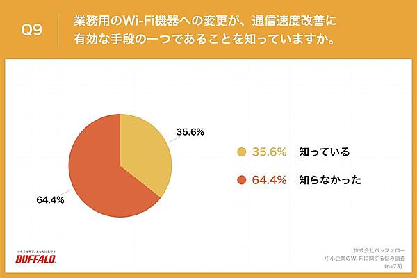 実際「会社のWi-Fiの通信速度が遅いことは、生産性の低下につながると思いますか」と全体に聞くと、「非常にそう思う」37.7%、「ややそう思う」32.1%が多く、通信速度は速いに越したことはないと思われる。しかし「業務用のWi-Fi機器への変更が、通信速度改善に有効な手段の1つであることを知っていますか」という質問には64.4%が「知らなかった」と回答している。