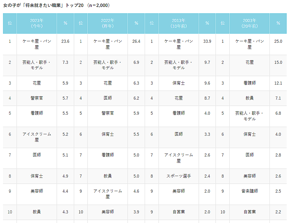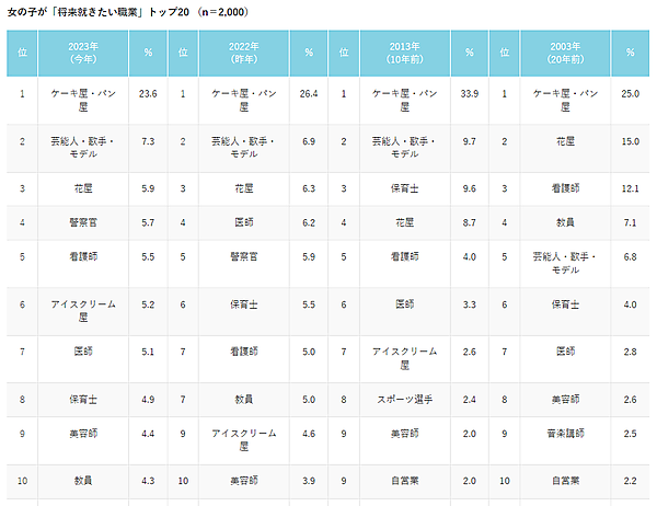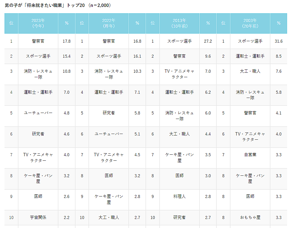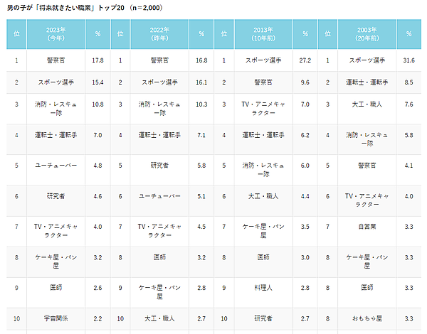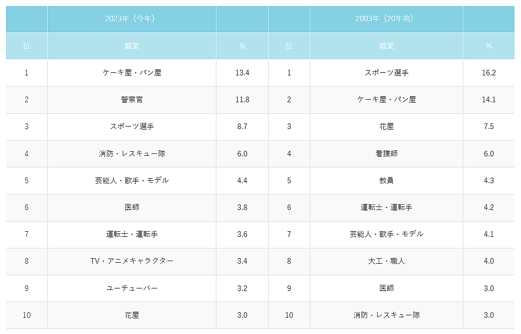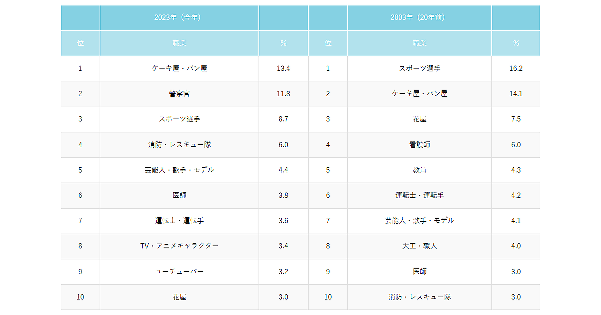 それによると、男女総合で子どもの将来就きたい職業は「ケーキ屋・パン屋」が1位。2位の「警察官」は男女両方で年々増えており、20年前(2003年)と比較すると、約4倍まで増加するなど、近い将来1位になると予測される。一方で圧倒的人気だった「スポーツ選手」は半減している。また20年前にはなかった「TV・アニメキャラクター」「YouTuber」がランクインしている。