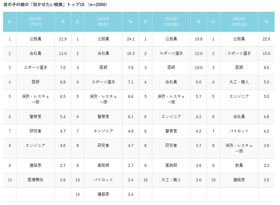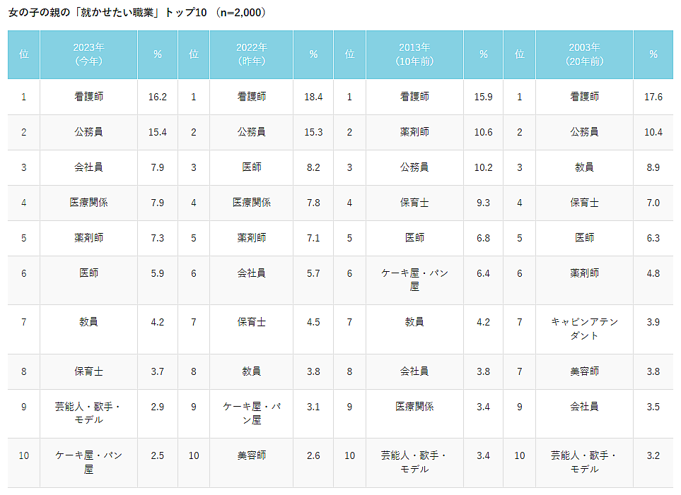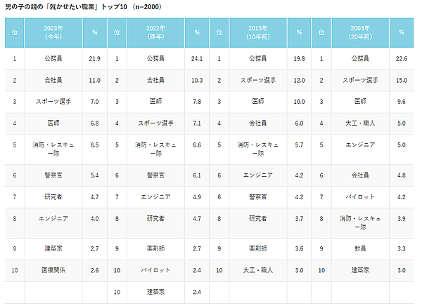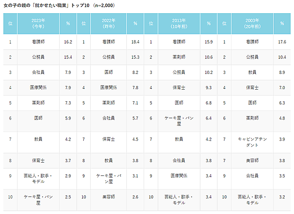 女の子に「親が将来就かせたい職業」では、「看護師」16.2%が2023年も1位だが、子ども側の「将来就きたい職業」では5位(5.5%)にとどまっている。将来就きたい職業1位の「ケーキ屋・パン屋」は、親が将来就かせたい職業では10位にとどまるほか、近年人気の「警察官」も親のトップ10に入っていない。逆に親から人気の「公務員」は、子どものランク外。女の子のほうが親と子どものギャップがやや目立つ結果と言えるだろう。
