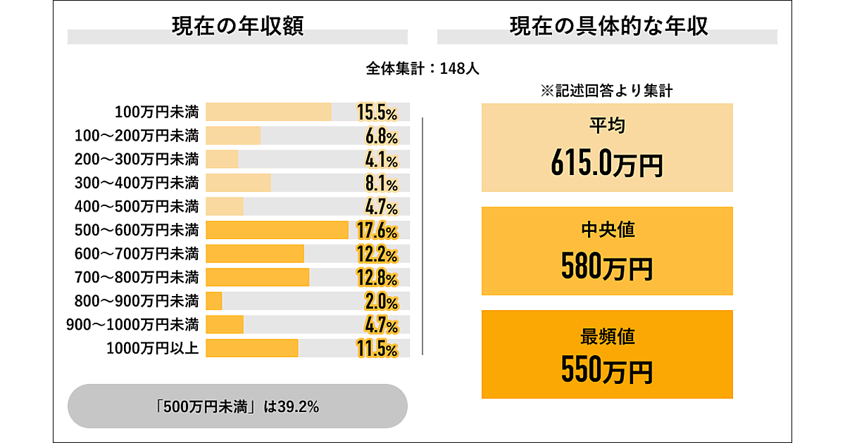 まず、現在の年収額を聞くと、「500〜600万円」が17.6%で最多になり、「500万円未満」と答えた人は計39.2%となった。具体的な額としては、平均は615.0万円、中央値は580.0万円という結果となった。