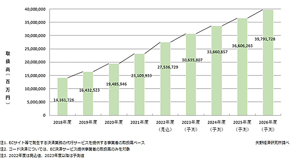 今後のEC決済サービス市場は、EC市場の裾野拡大に加え、公金領域などにおけるオンライン化の進展や、BtoB領域やオムニチャンネル・オフライン決済などの対象領域の拡大が進むことから、2026年度には39兆7,917億円と、ほぼ40兆円規模にまで市場が成長すると予測されている。