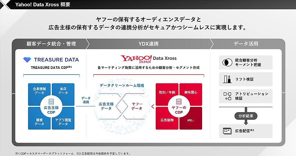 トレジャーデータが国内外450社以上に提供する顧客データ活用サービス「Treasure Data CDP」内に格納されたデジタル広告やメール配信、アプリプッシュ通知の履歴など企業が保有する顧客データを、プライバシー保護を最重視した安全な環境で取り扱い、ヤフーが保有する購買意向や興味関心などのデータを用いて分析できる。LINEなどのZホールディングスグループ企業の保有するデータとの連携も、将来的な構想として検討する。