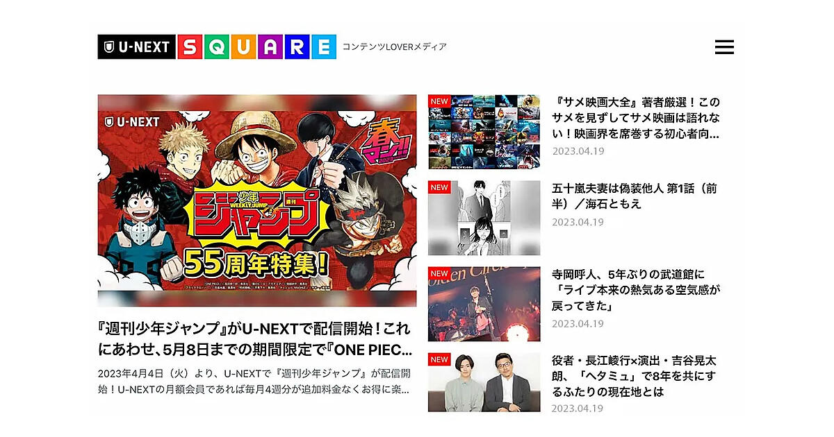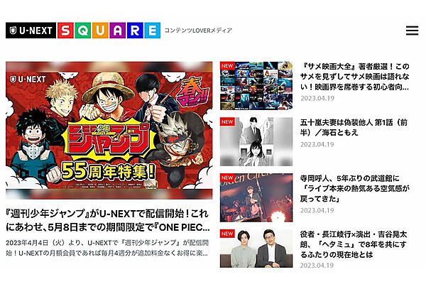 動画配信サービス「U-NEXT」を展開するU-NEXTは、Webメディア「U-NEXT SQUARE(ユーネクストスクエア)」を4月19日に始めた、と同日発表した。映画やドラマ、アニメなどコンテンツに触れる機会を増やし、さまざまな角度から作品を勧める。