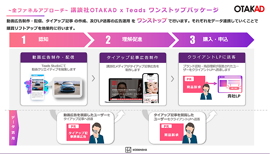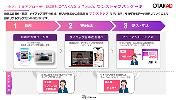 「OTAKAD x Teadsワンストップパッケージ」は、認知獲得動画広告の配信施策と、タイアップ記事広告制作の連携を強化してLP送客する。動画広告を見たユーザーにタイアップ記事閲読を促すことで1ユーザーに対して連続した施策を行い、更なる訴求商品理解を無駄なく促せる。進化型のタイアップ広告としてブランドの適合性や、コンテキスト(文脈)ターゲティングによるセグメント強化施策の導入を可能にした。