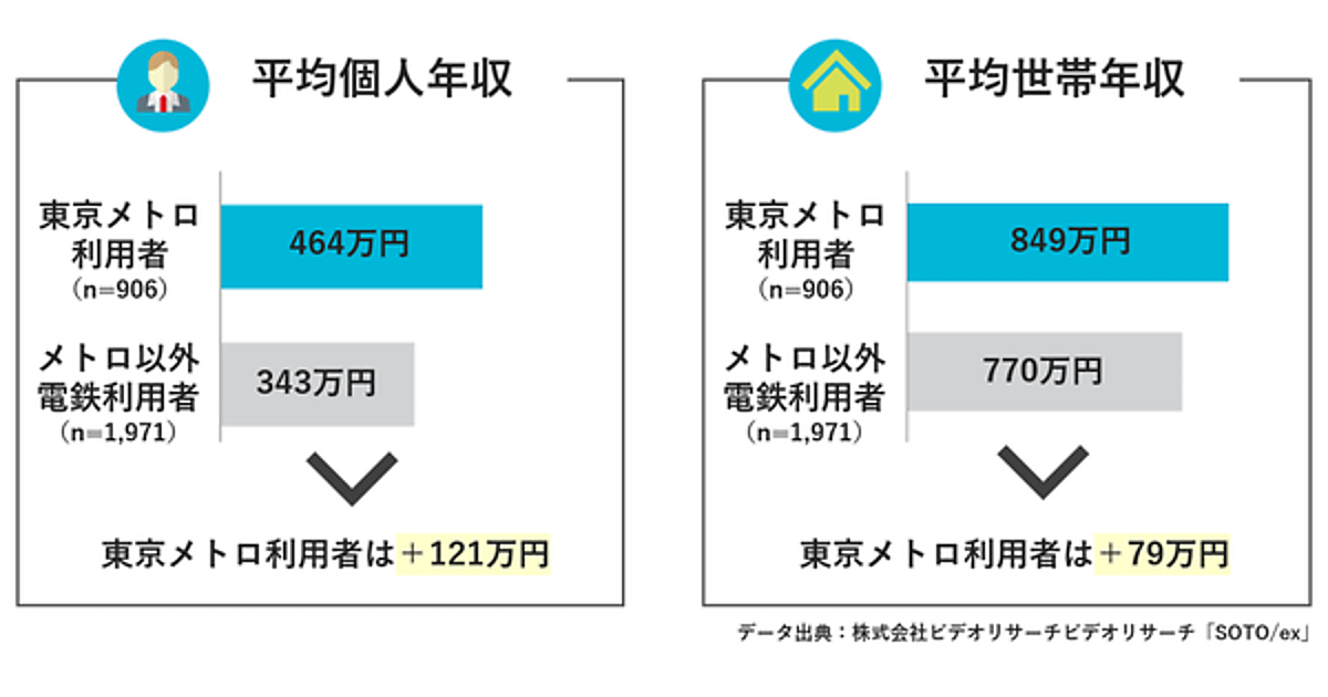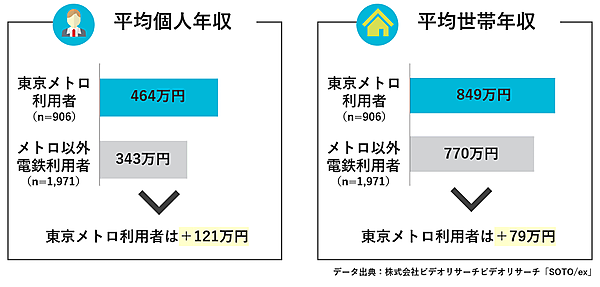 そして「平均の個人年収」を見ると、東京メトロ利用者における平均個人年収は464万円だったのに対し、メトロ以外の電鉄利用者は343万円と、121万円もの差を見せた。「平均世帯年収」についても、メトロ利用者は849万円だったが、メトロ以外の電鉄利用者は770万円と、79万円の差を見せたという。