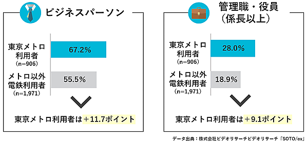 利用者の属性を見ると「ビジネスパーソン」(就業者のうちアルバイト、パート、内職、自営業主、その他を除いた人)の占める割合が多く67.2%で、メトロ以外の電鉄利用者よりも約11.7ポイント上回る。役職で見ると「管理職・役員(係長以上)」が東京メトロ利用者は28.0%、メトロ以外の電鉄利用者は18.9%と、これも大きく上回る。沿線企業が多く役職も多いため、東京メトロの広告はこうした層に影響力を持つと推察される。