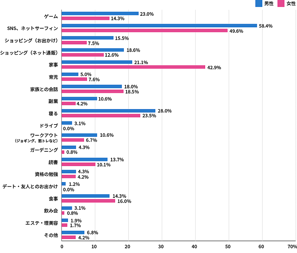 「実際に勤務中にどんなサボりをしていますか?」と聞くと、1位は男女ともに「SNS、ネットサーフィン」だった。一方2位を見ると、男性は「寝る」28.0%が多数だが、女性は「家事」42.9%が多かった。そして男性3位は「ゲーム」23.0%に対し、女性3位は「寝る」23.5%と差異が見られる。女性の場合、ちょっとした時間を家事に充ててしまうのは仕方ないケースも多く、男女それぞれを巡る違いが浮き彫りになったと言えるだろう。