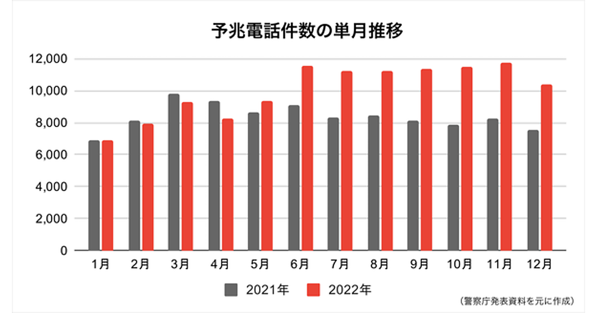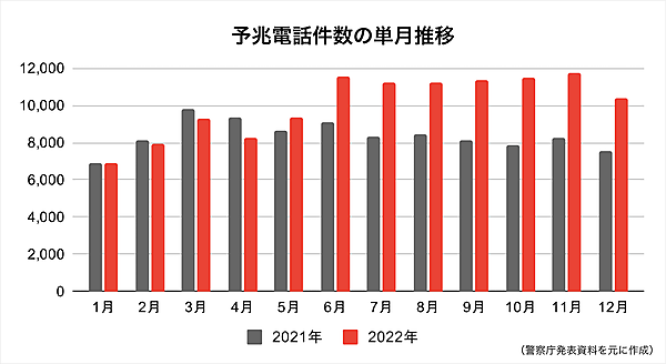 まず警察庁の発表によると、2022年の特殊詐欺の認知件数は17,520件(前年比3,022件増)、被害額は361.4億円(前年比79.4億円増)で2021年から大きく増加していた。犯行前にターゲットの資産、家族構成、利用金融機関、在宅状況などを聞き出す「予兆電話(アポ電)」が確認された件数は、2022年は12万0,701件(前年比2万186件増)で、前年より大きく増加している。