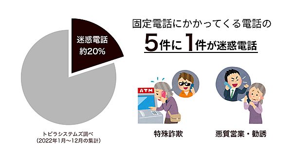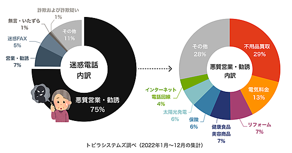 同社調査によると、2022年の固定電話にかかる着信の約20%が迷惑電話であるという。さらに固定電話にかかる迷惑電話のうち約75%は“断ったにも関係なく再度勧誘したり、社名を偽ったりする”など、特定商取引法に抵触するような電話勧誘を行う「悪質営業・勧誘」の電話だった。