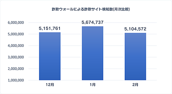 それによると、2023年2月における「詐欺ウォールによる詐欺サイト検知数」は510万4,572件。2023年1月の567万4,737件と比較すると、マイナス57万0,165件と大幅に減少した。