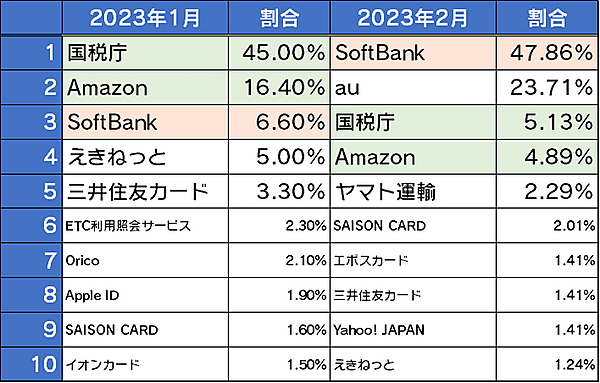 フィッシングサイトをブランドごとに見ると、1位が「SoftBank」47.86%となり、ほぼ半分を占める。2位「au」23.71%も大幅に比率が増えていた。
