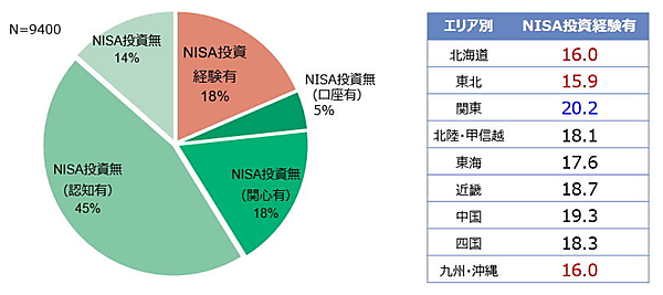 まず「現行のNISAにおける投資経験」を聞くと、経験者は18.0%。地域別だと「関東」20.2%は特に高く「中国」19.3%がそれに続く。逆に「北海道」16%、「東北」15.9%は低い。