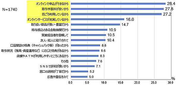 「金融機関の選定理由」では、ネット証券・ネット銀行の特長である「オンラインで申込ができるから」28.4%、「取引手数料が安いから」27.8%が高い。「日ごろ利用しているから」を理由にした人は地元銀行を利用していると思われる。