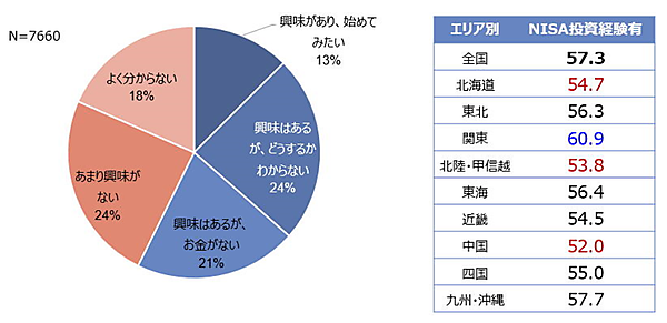 さらに現行NISAを利用したことがないという7,660人たちに「NISA制度拡充(新NISA)に対する興味・認識」を聞くと、「興味があり、始めてみたい」13%、「興味はある(どうするか未定)」24%、「興味はある(お金がない)」21%と、計57.3%が興味を示した。地域別ではやはり「関東」60.9%が平均より高いが、同じく経験者の多い「中国」が52.0%と真逆の反応を示しているのが興味深い。