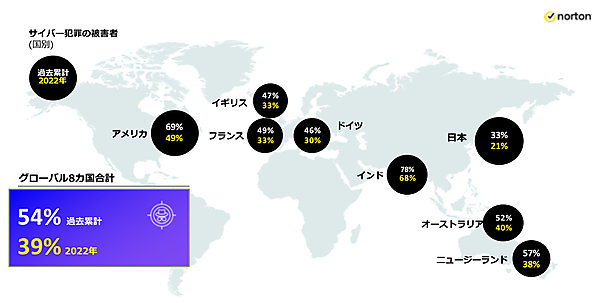 それによると、日本では成人の3人に1人(33%)が、何らかの形でサイバー犯罪の被害に遭遇。5人に1人以上(21%)が2022年にサイバー犯罪に遭遇していた。なお調査対象の8カ国全体だと、2022年には約5人に2人(39%)がサイバー犯罪を経験していた。