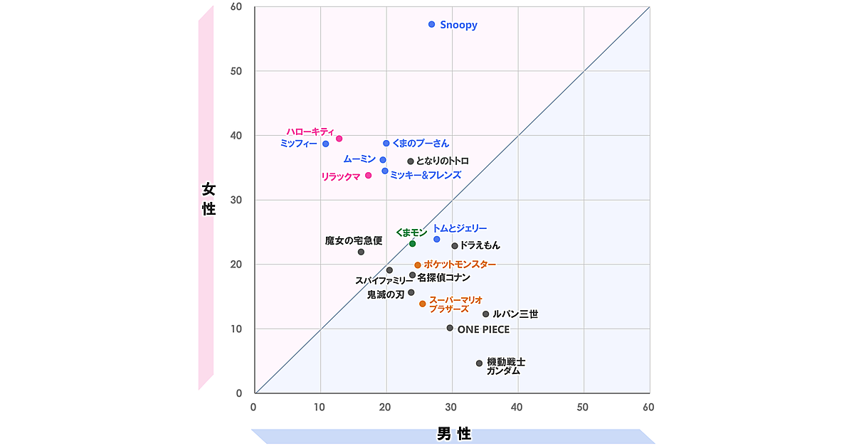 上位20キャラクターについてグラフ化すると、上図のようになった。「ハローキティ」「ミッフィー」「くまのプーさん」などは女性人気が高く、特に「Snoopy」は、女性の好感スコアが57.2と圧倒的だった。一方で、「機動戦士ガンダム」「ONE PIECE」「ルパン三世」といった漫画やアニメ・ゲームキャラは男性に多く支持されていた。