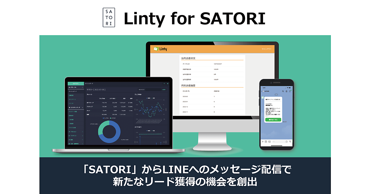 マーケティング自動化(MA)ツール開発・販売のSATORIは、同ツール「SATORI」で、LINEのコミュニケーションツール「LINE」への配信オプション「Linty for SATORI」の提供を始めた、と4月27日発表した。企業の「LINE公式アカウント」に「友だち」追加している顧客に対し、ツールのSATORIのメール配信機能を使ってLINEのメッセージが配信できる。