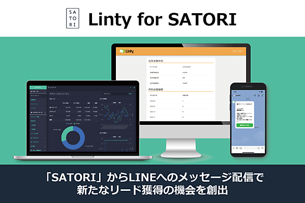 Linty for SATORIは①顧客の行動に合わせた自動アプローチ②顧客の行動履歴の一元管理③新たなチャネルのリード獲得--が可能。③は、SATORIを通じて配信するメッセージのトラッキングURLから行動を可視化し、自社サイトを訪問したかが分かる。SATORI上で実名化登録を促すコンテンツの表示設定をすると、問い合わせや申し込みなどを促せる。