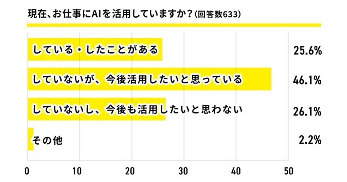 実際に仕事にAIを活用しているかという質問では、約4人に1人のフリーランスが「している・したことがある」と回答。「していないが、今後活用したいと思っている」という回答も半数近くとなり、AIの活用に前向きな人が多いことがうかがえた。