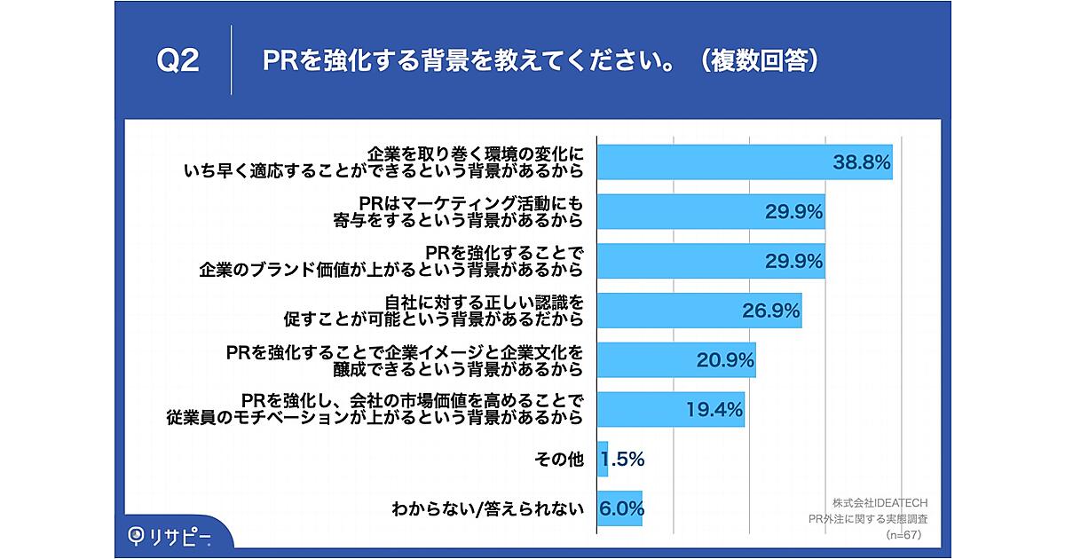 「PRを強化する背景・理由」を聞くと、「企業を取り巻く環境の変化にいち早く適応できるという背景があるから」38.8%、「PRはマーケティング活動にも寄与をするという背景があるから」29.9%、「PRを強化することで企業のブランド価値が上がるという背景があるから」29.9%が上位だった。