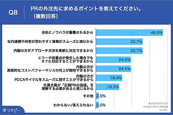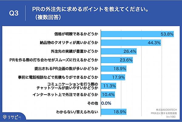 PRを外注しているという企業も多い。そこで「“PRの外注”に対して課題を感じていますか」と全体に聞くと、「非常にそう感じる」6.6%、「ややそう感じる」48.1%となった。また「PRの外注先に求めるポイント」を全体に聞くと、「価格が明瞭であるかどうか」53.8%、「納品物のクオリティが高いかどうか」44.3%、「外注先の実績が豊富かどうか」26.4%が上位で、コストが重視されている。