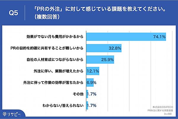 そこで「“PRの外注”に対して課題を感じている」とした58人に課題内容を聞くと、「効果がでない月も費用がかかるから」74.1%、「PRの目的を的確に共有することが難しいから」32.8%、「自社の人材育成につながらないから」25.9%と、やはりコスパをあげる回答が特に多かった。