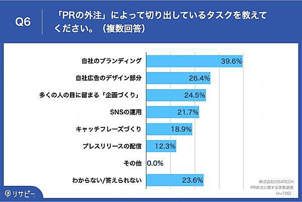 具体的に「外注しているタスク」を聞くと、「自社のブランディング」39.6%、「自社広告のデザイン部分」26.4%、「多くの人の目に留まる“企画づくり”」24.5%が上位だった。