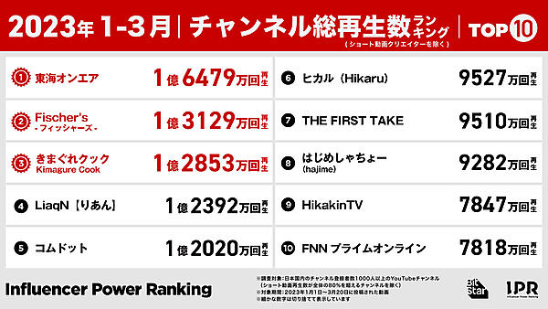 まず「チャンネル総再生数(ショート動画クリエイターを除く)」(2023年1月1日~3月20日にYouTubeに投稿された動画において、同期間に多く再生されたチャンネル)は「東海オンエア」が最多で、「フィッシャーズ」「きまぐれクック」がそれに続いた。古参YouTuberが引き続き動画の面白さで視聴者を吸引し、再生数をキープした。