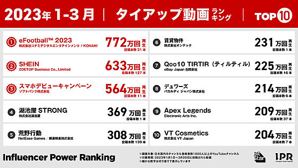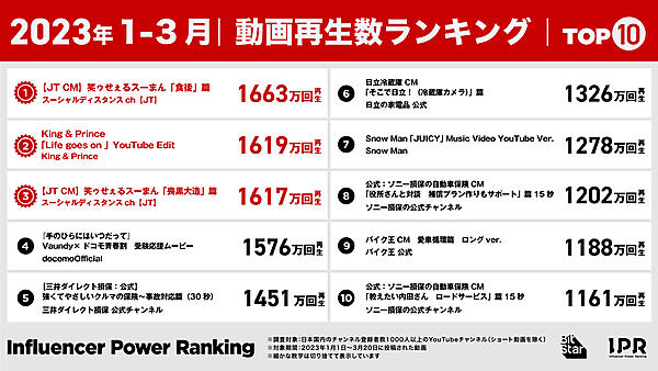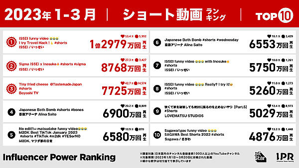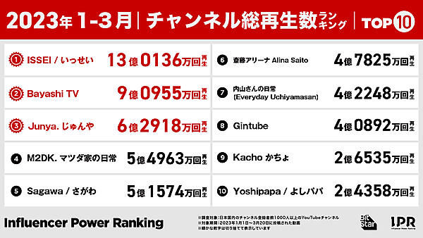 BitStarは、最新インフルエンサーパワーランキング(IPR)を発表した。独自開発した分析ツール「IPR」のデータに基づき、2023年1月~3月に活躍した動画クリエイターや動画チャンネルについて、以下の項目を分析した内容となっている。