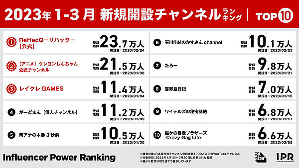 さらに新規開設されたチャンネルのランキング(登録者数)では、「ReHacQ−リハック−【公式】」23.7万人、「【アニメ】クレヨンしんちゃん公式チャンネル」21.5万人が特に多かった。