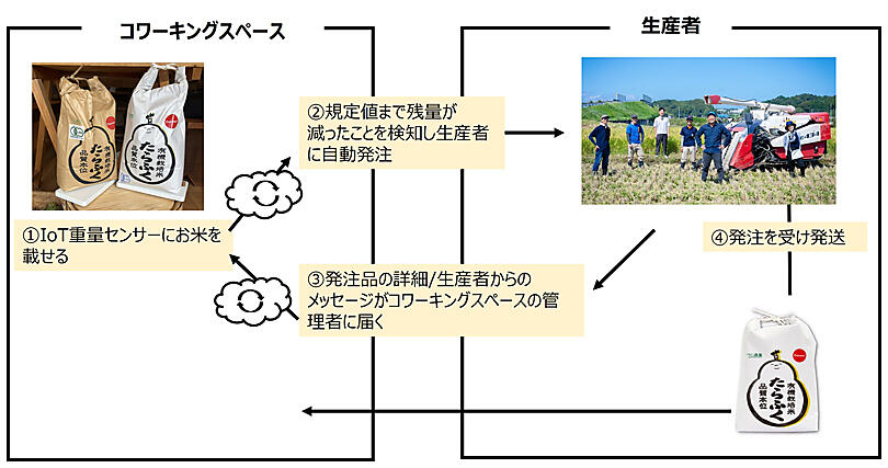 IoT重量センサーを用いて、コワーキングスペースに常備されているお米の残量を遠隔把握し、規定値まで減ると自動的にお米を発注する仕組みを構築した。発注後は、つじ農園から発注完了のお知らせと、お米をおいしく食べられるレシピなどのメッセージが同時に届く仕様にした。今回の実証を通じて、コワーキングスペースの無人化・省人化への貢献と管理人の業務効率向上、生産者と購入者が直接つながる効果を検証する。