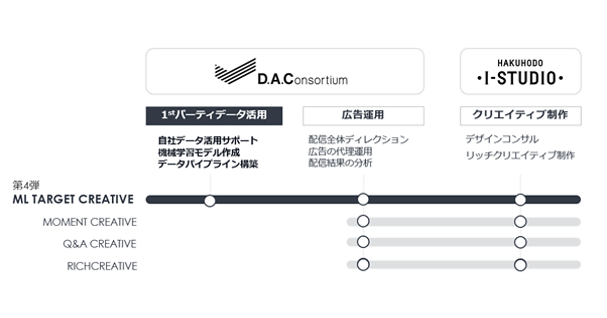 デジタルマーケティングサービス事業のデジタル・アドバタイジング・コンソーシアム(DAC)と、サイト・アプリ制作やシステム開発の博報堂アイ・スタジオは、CDP(顧客データ基盤)と機械学習(Machine Learning)の活用から広告配信の運用オペレーションを一体化した「ML TARGET CREATIVE」の提供を始めると5月11日に発表した。機械学習で得た特徴量を活用し、最適なターゲットへの配信と高品質な広告体験を提供する。
