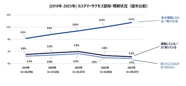 まず全体に「カスタマーサクセスという言葉を聞いたことがあるか?」と聞くと、「ある」は全体の17.5%にとどまり、「ない」が5年連続で8割を超えた。さらに聞いたことがある人のなかで、「カスタマーサクセスとは何かを理解している」とした人は全体のわずか2.2%で、過去5年でもっとも低かった。
