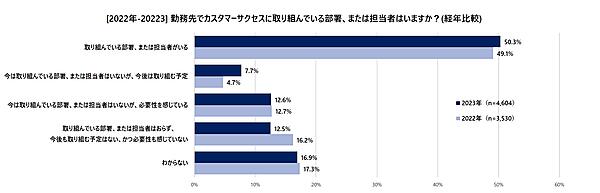 一方カスタマーサクセスを認知している4,604人に対し「勤務先でカスタマーサクセスに取り組んでいる部署、または担当者がある/いるか」を聞くと、「部署がある/担当者がいる」50.3%で過去5年で初めて半数を超えた。取り組みの予定がある人も前年より増加している。勤務先従業員規模別では10人未満規模の企業で「取り組んでいる部署、または担当者がいる」とした割合が大きく伸長したという。