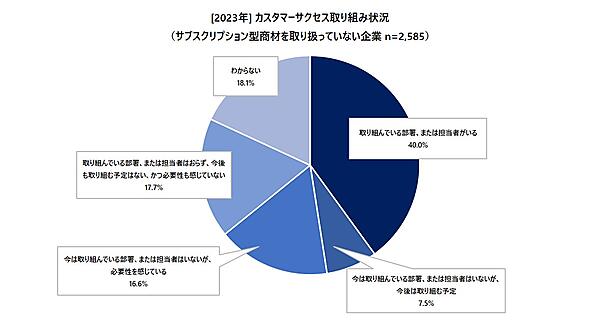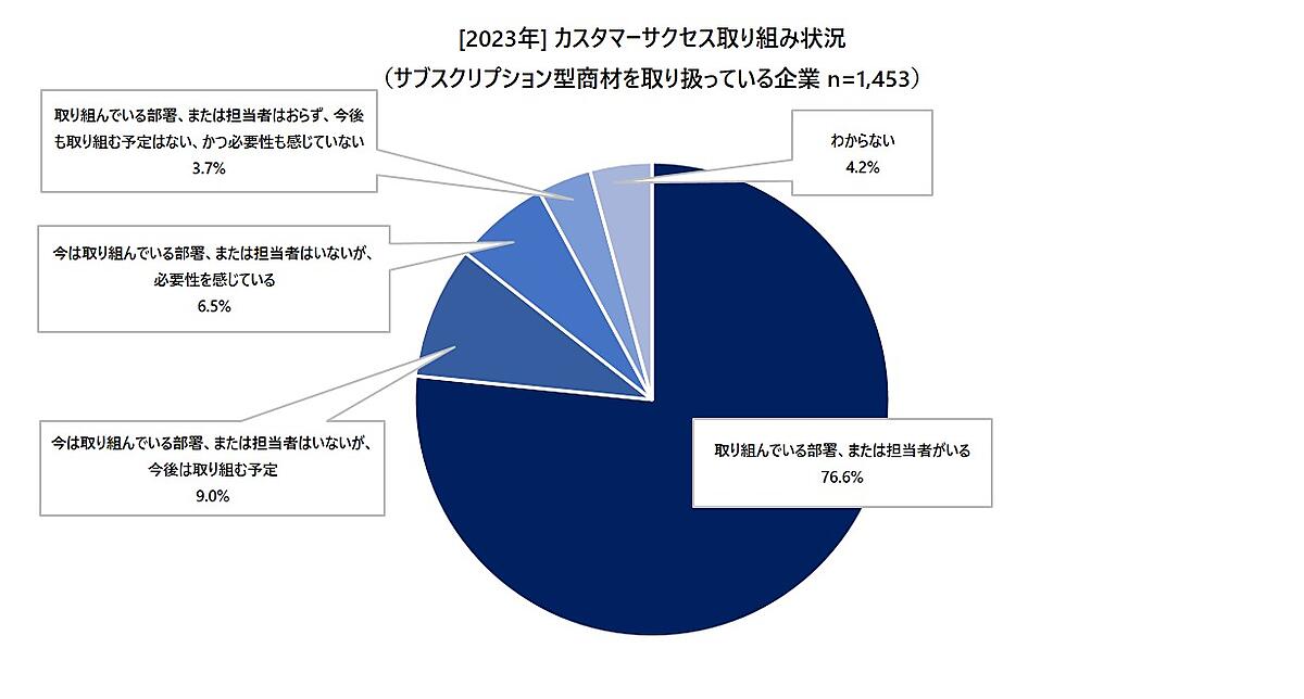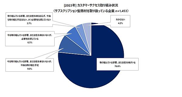 定期的な接触が発生する「サブスクリプション型商材」は、カスタマーサクセスとの相性がよいとされている。そのためかサブスクリプション型商材取り扱い企業では78.6%が「カスタマーサクセスの部署がある/担当者がいる」と回答している。「今後取り組む予定」9.0%、「必要性を感じている」6.5%も一定数存在する。逆にサブスクリプション型商材を扱っていない企業では、「カスタマーサクセスの部署がある/担当者がいる」は40.0%にとどまったが、多くの企業が注力しているのは間違いないようだ。