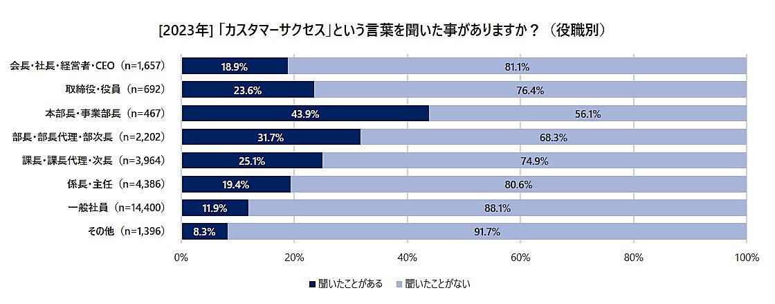 認知・理解を役職別で見ると、会長・社長・経営者・CEOといった企業トップ層では、「カスタマーサクセスという言葉を聞いたことがない」が81.1%を占めていた。取締役・役員でも76.4%が「聞いたことがない」としている。