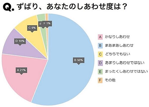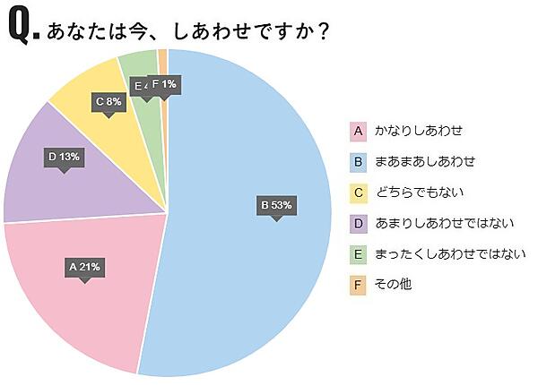 全体に「あなたは今、しあわせですか?」と聞くと、「まあまあしあわせ」53%(前年より3%減)、「かなりしあわせ」21%(前年±0%)で、はいと回答した人(かなり+まあまあの合計)は全体の74%となった。社会不安や世界情勢の変化があったためか、やや数値は微減している。