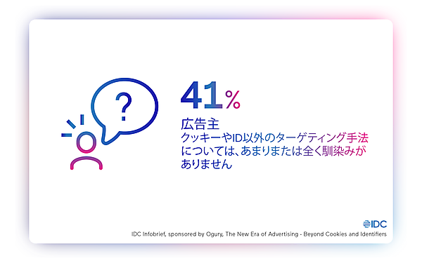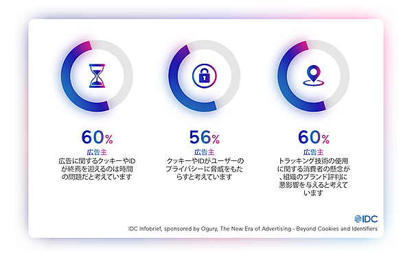 まず広告主の60%は「ユーザートラッキングはブランドの信頼性を損ねるリスク」だと考えていた。また56%は「クッキーやIDがユーザーのプライバシーを脅かす」、60%は「クッキーやIDが廃止されるまで時間の問題である」と考えていた。