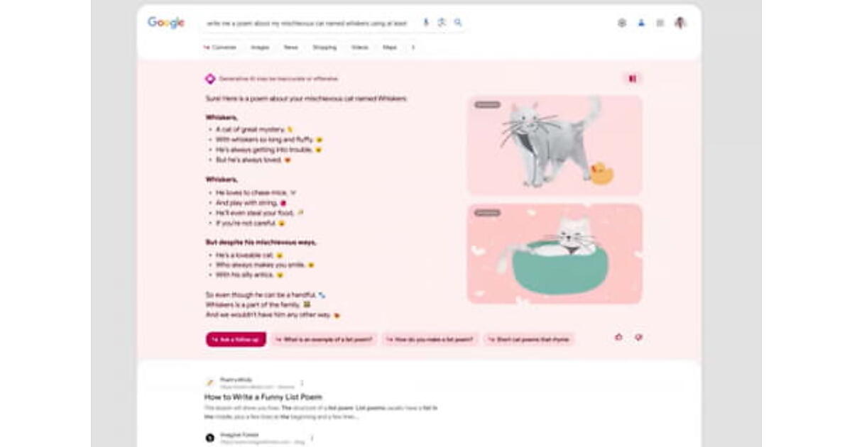 SGEは、Google検索に生成AIを導入する新たな仕組みで、質問から質問へと文脈を引き継ぎながら、Webコンテンツや画像を紹介し、自然にトピックに関する探索を行なえるようにする。