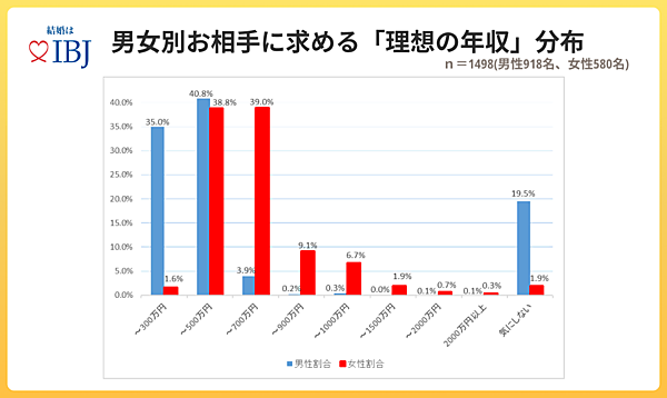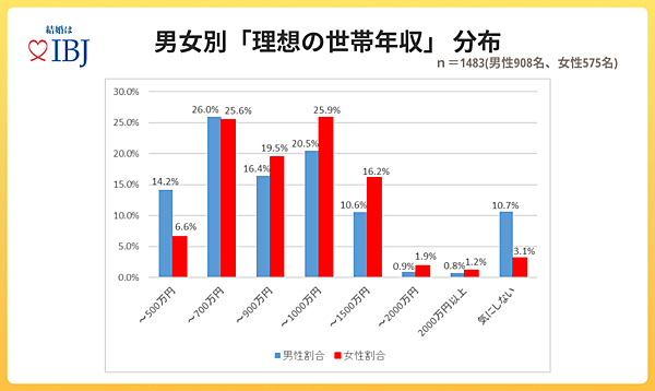 婚活事業を複合展開するIBJは、「理想の世帯年収」「理想の年収」に関する調査結果を発表した。婚活中の男女1,539人が回答している。