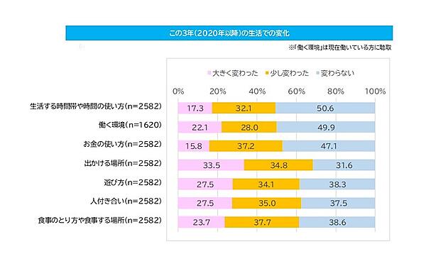 まず生活に関わる「時間」「労働環境」「お金」「場所」「遊び」「人付き合い」「食事」の7項目について、コロナ禍の3年で変化があったかどうかを聞いた。その結果どの項目でも、半数近くあるいはそれ以上が「大きく変わった+少し変わった」と回答していた。