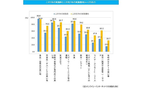 次に行動パターンごとに「ここ1年に実施したか」「この先1年に実施したいか」を聞くと、いずれの項目でも今後あらためて実施したいという意向が強い。特に「旅行・レジャー」「温浴(銭湯や温泉等)・サウナ」「ライブ・コンサート・フェス」は大きく、「有料のセミナーや習い事」は倍以上の意向となっている。コロナ禍が沈静した場合、2023年は経済活動がかなり活発になりそうだ。