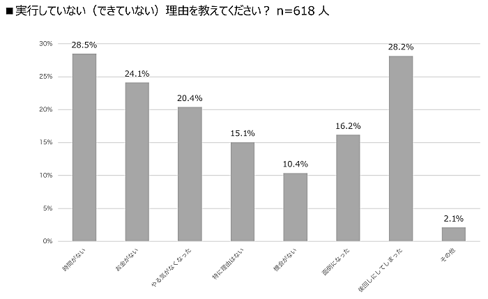 「実行していない」「続けられなかった」と回答した618人に「実行していない(できていない)」理由を聞くと、「時間がない」28.5%、「後回しにしてしまった」28.2%が上位だった。