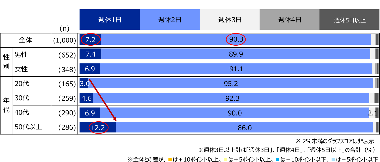 まず、現在の勤め先の休日数を聞いたところ、「週休2日」が最も多く、90.3%を占めた。