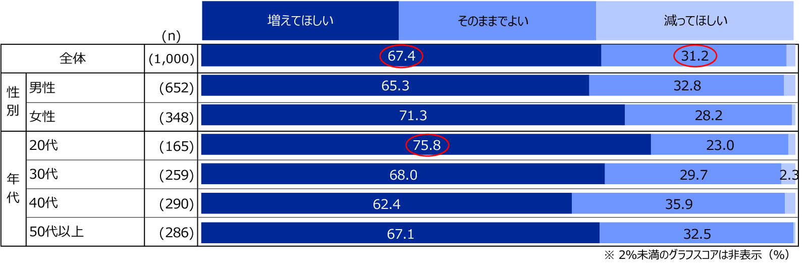 現在の勤め先の休日数についてどう思うかを聞くと、「増えてほしい」と回答した人は67.4%で、特に20代は全体より5ポイント以上高かった。