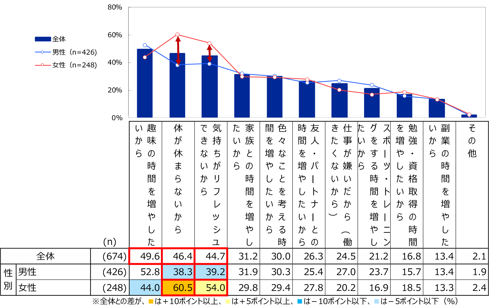 「増えてほしい」と回答した理由としては、「趣味の時間を増やしたいから」が約半数を占めた。男女別でみると、女性は「体が休まらないから」「気持ちがリフレッシュできないから」が男性よりも10ポイント以上高く、心身のケアを優先している傾向が見られた。